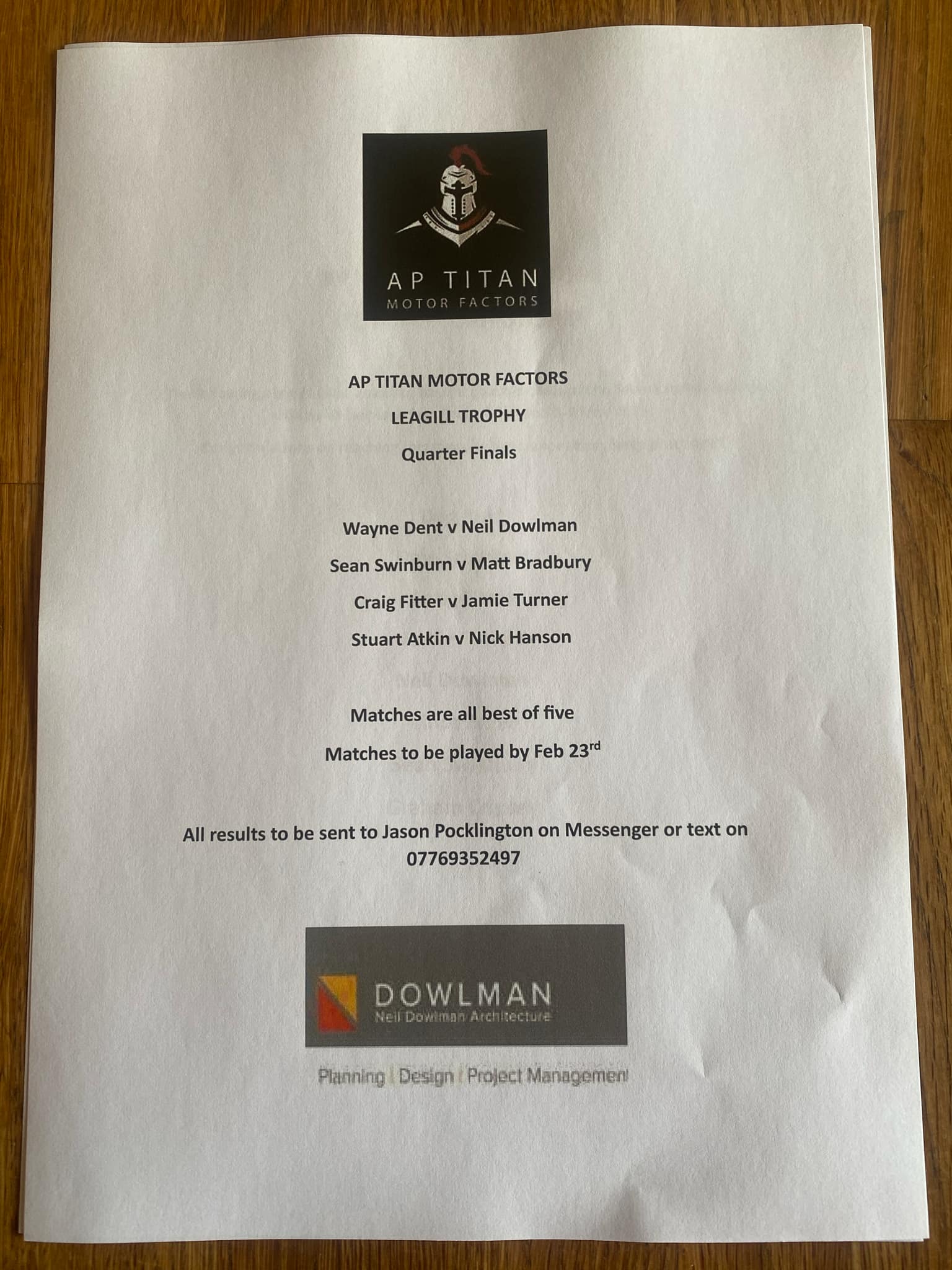 These matches ARE handicapped. All League teams are automatically entered into the draw. A team may decide not to enter by notifying Competitions Secretary. Each round played by a team of 4 players, playing 2 frames each. All balls should be potted and all scores kept, in case of a tie in frame scores. Before play begins, each captain should separately write down the order of play for each player in their team. These should then be matched together, making the order of play.